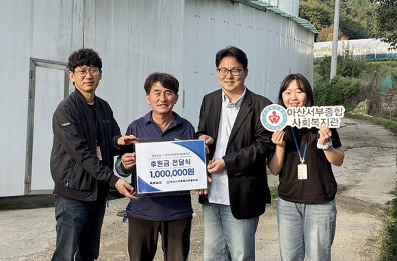 ¿¹»ê±º ´ë¼ú¸é¿¡ À§Ä¡ÇÑ Ãà¿ø³óÀå(´ëÇ¥ ÃÖ¼±¿ë)Àº 9¿ù 30ÀÏ(È) Áö¿ª»çȸ º¹Áö ÁõÁøÀ» À§ÇØ ¾Æ»ê¼ºÎÁ¾ÇÕ»çȸº¹Áö°ü(°üÀå ±Ç¹ü)¿¡ ÈÄ¿ø±Ý 100¸¸ ¿øÀ» Àü´ÞÇÏ¸ç µû¶æÇÑ ÀÌ¿ô»ç¶ûÀ» ³ª´³´Ù.