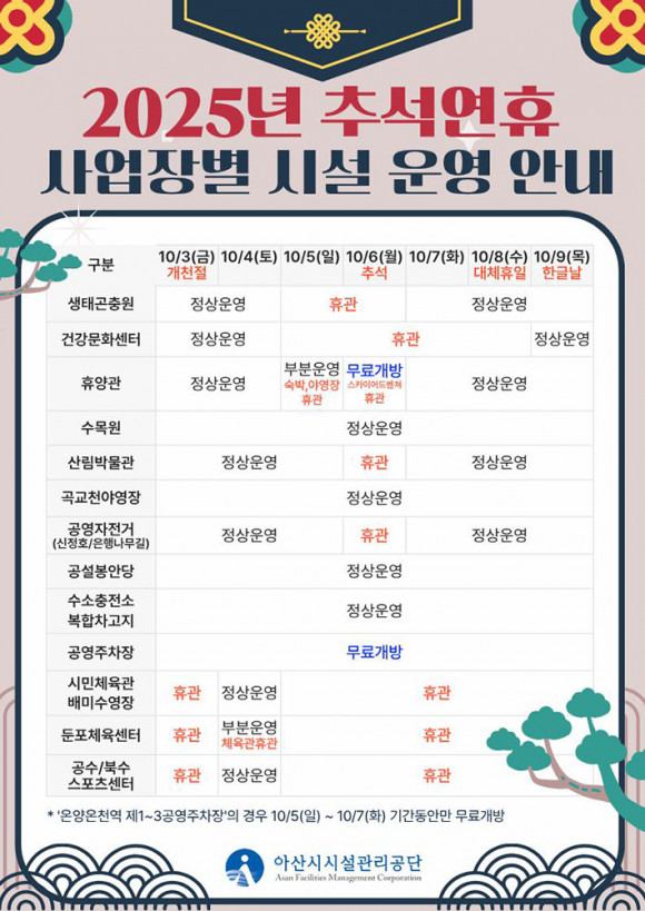 ¾Æ»ê½Ã½Ã¼³°ü¸®°ø´Ü(ÀÌ»çÀå ±èÈ¿¼·, ÀÌÇÏ °ø´Ü)Àº ¹ÎÁ· ´ë¸íÀýÀÎ Ãß¼® ¿¬ÈÞ¸¦ ¸Â¾Æ ½Ã¹ÎµéÀÌ ¾ÈÀüÇÏ°í Æí¾ÈÇÏ°Ô °ø´Ü ¿î¿µ ½Ã¼³¹°À» ÀÌ¿ëÇÒ ¼ö ÀÖµµ·Ï »ç¾÷À庰 ¿î¿µ ÀÏÁ¤À» ¾È³»Çϰí, ¿¬ÈޱⰣ Áß ¾ÈÀü°ü¸®¿¡ ¸¸ÀüÀ» ±âÇÒ °èȹÀÌ´Ù.