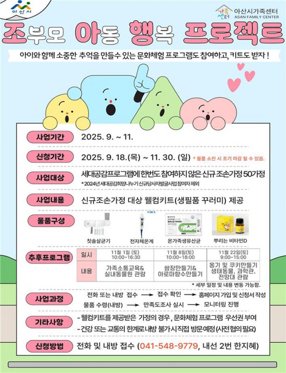 ¾Æ»ê½Ã°¡Á·¼¾ÅÍ(¼¾ÅÍÀå ¿ìÁ¤¹Î)´Â Á¶¼Õ°¡Á¤ÀÇ ÀÇ»ç¼ÒÅë Çâ»ó ¹× »îÀÇ Áú Çâ»óÀ» À§ÇØ ¡®2025³â Á¶ºÎ¸ð¡¤¾Æµ¿ Çູ ÇÁ·ÎÁ§Æ®¡¯¸¦ ÃßÁøÇÑ´Ù°í ¹àÇû´Ù.