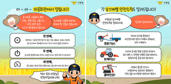 ÀÌ¿¡ ¾Æ»ê¼Ò¹æ¼´Â ¡ãù°, ȸÀüü´Â °¡±ÞÀû ¾ÈÀü µ¤°³°¡ ÀÖ´Â °ÍÀ» »ç¿ëÇϰí, ¼Ò¸Å³ª ¿ÊÀÚ¶ô µîÀÌ ³ó±â°è¿¡ ¸»·Áµé¾î°¡°Å³ª °¨°Ü ³¢ÀÌÁö ¾Êµµ·Ï ÁÖÀÇÇϱ⠡ãµÑ°, ³ó±â°è¸¦ Á¡°ËÇÒ ¶§´Â ¹Ýµå½Ã ½Ãµ¿À» ²ô°Å³ª Àü¿ø Â÷´ÜÇϱ⠡ã¼Â°, Á¼Àº ³ó·Î¿Í °æ»ç·Î µîÀ» ÀÌ¿ëÇÒ ¶§´Â ÁøÀÔ Àü ¹Ì¸® ¼Óµµ ÁÙÀÌ±â µî ²À ÇÊ¿äÇÑ ³ó±â°è ¾ÈÀü¼öÄ¢¿¡ ´ëÇØ °Á¶Çß´Ù.