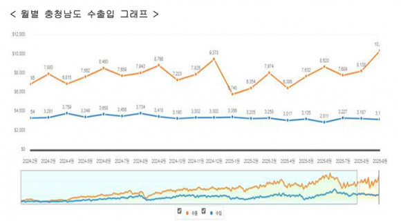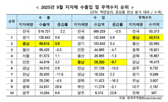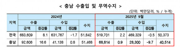 ¡®2025³â 9¿ù ÃæÃ»³²µµ ¼öÃâÀÔ µ¿Çâ º¸°í¡¯¿¡ µû¸£¸é, 9¿ù ¼öÃâ¾×(´©°è)Àº 688¾ï ´Þ·¯, ¼öÀÔ¾×(´©°è)Àº 283¾ï ´Þ·¯¸¦ ±â·ÏÇØ ¹«¿ª¼öÁö(´©°è) 405¾ï ´Þ·¯ ÈæÀÚ¸¦ ´Þ¼ºÇß´Ù.