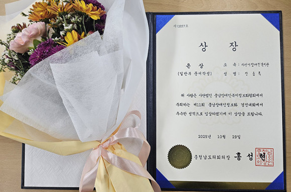 Çѱ¹ÁöüÀå¾ÖÀÎÇùȸ ¾Æ»ê½ÃÀå¾ÖÀκ¹Áö°ü(À±Á¤¹® °üÀå)Àº Áö³ 10¿ù 24ÀÏ, Á¦11ȸ Ãæ³²Àå¾ÖÀÎÁ¤º¸È°æÁø´ëȸ ¹®¼ÀÛ¼º ºÎ¹®¿¡ 3¸íÀÌ Âü°¡ÇØ ±×°£ ³ë·ÂÀÇ °á½Ç·Î Áø½Â¿Á ´ÔÀÌ ÃæÃ»³²µµ ÀÇÀå»ó [Àº»ó]À» ¼ö»óÇÏ´Â Äè°Å¸¦ ÀÌ·ï³Â´Ù.