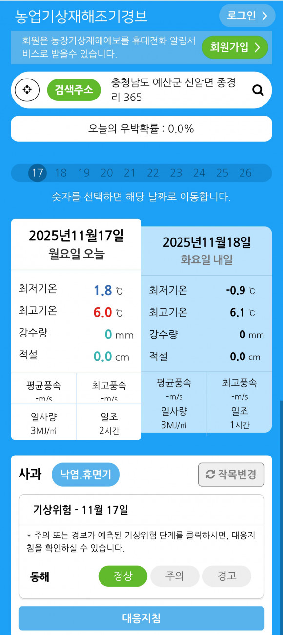 ÀÌ¿Í ÇÔ²² ³óÃÌÁøÈïûÀÇ ¡®³ó¾÷±â»óÀçÇØ Á¶±â°æº¸¼ºñ½º¡¯¸¦ Àû±Ø Ȱ¿ëÇØ µµ³» 3180È£ Ãë¾à³ó°¡¸¦ ´ë»óÀ¸·Î ³óÀå ´ÜÀ§ »ó¼¼ ±â»óÁ¤º¸¿Í ÀÛ¹°º° ÀçÇØ ¿¹ÃøÁ¤º¸ ¹× »çÀü¡¤Áï½Ã¡¤»çÈÄ ´ëÀÀÁöħÀ» ¹®ÀÚ¡¤Ä«Ä«¿ÀÅå µîÀ» ÅëÇØ ½Ç½Ã°£ Á¦°øÇÑ´Ù.
