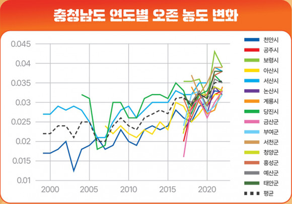 ±èÁ¾¹ü ¹Ú»ç´Â ¡°ÃæÃ»³²µµ´Â 2018³â µµ³» 15°³ ½Ã±º¿¡ µµ½Ã´ë±â ÃøÁ¤¼Ò¸¦ ¿ÏºñÇßÀ¸¸ç, ÇöÀç 40°³¼Ò°¡ ¿î¿µ Áß¡±À̶ó¸ç ¡°µµ³» Æò±Õ ¿ÀÁ¸ ³óµµ´Â 2018³â 30.4ppb¿¡¼ Á¡ÁøÀûÀ¸·Î »ó½ÂÇØ ¿ÔÀ¸¸ç, °èÀýº°·Î´Â Àڿܼ±ÀÌ °ÇÑ º½(41.8ppb)°ú ¿©¸§(38.0ppb)¿¡ ³ô°Ô ³ªÅ¸³µ°í, Áö¿ªº°·Î´Â ÇØ¾È°¡ Áö¿ª(º¸·É, ¼»ê, ÅÂ¾È µî)¿¡¼ ³óµµ°¡ ³ô°í ³»·úÀ¸·Î °¥¼ö·Ï ³·¾ÆÁö´Â °æÇâÀ» º¸¿´´Ù¡±°í ºÐ¼®Çß´Ù.