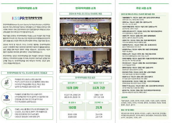 Çѱ¹¾ð·ÐÁøÈïÀç´ÜÀÇ ÈÄ¿øÀ¸·Î ¼³¸³µÈ Çѱ¹PRÇлýȸ´Â Àü±¹ 19°³ ´ëÇаú Áö¿ª»çȸ 33°³ ±â°üÀÌ Âü¿©ÇÏ´Â ±¤°í¡¤PR ¿¬ÇÕ Çлý Á¶Á÷À¸·Î, Áö¿ª»çȸ ¿¬°è ÇÁ·ÎÁ§Æ®¿Í ½Ç¹«Çü ±¤°í¡¤PR ±³À°À» ¼öÇàÇÏ´Â Çлý ÁÖµµ Ç÷§ÆûÀÌ´Ù.