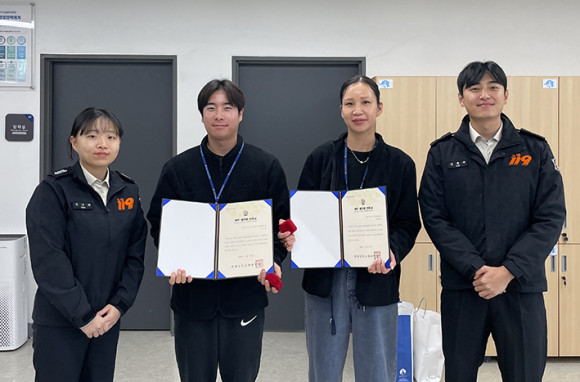 ¾Æ»ê½Ã½Ã¼³°ü¸®°ø´Ü(ÀÌ»çÀå ±èÈ¿¼·, ÀÌÇÏ °ø´Ü) ¹è¹æºÏ¼ö½ºÆ÷Ã÷¼¾ÅÍ Á¤ÇýÇö¡¤ÀÌÈ£ÁØ °»ç°¡ ½ÉÆó¼Ò»ý¼ú(CPR)·Î À̿밴ÀÇ »ý¸íÀ» ±¸ÇÑ °ø·Î¸¦ ÀÎÁ¤¹Þ¾Æ ÃæÃ»³²µµ ¼Ò¹æº»ºÎ·ÎºÎÅÍ ¡®ÇÏÆ®¼¼À̹ö(Heart Saver)¡¯ ¹èÁö¿Í ÀÎÁõ¼¸¦ ¼ö¿© ¹Þ¾Ò´Ù.