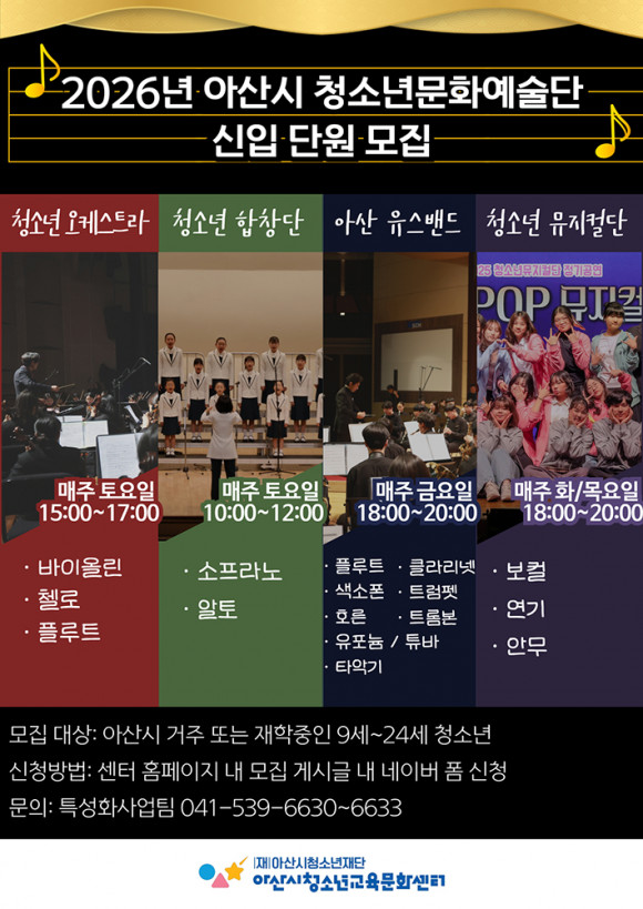 ¾Æ»ê½Ãû¼Ò³â±³À°¹®È¼¾ÅÍ(°üÀå ¹èÁ¤¼ö)´Â 2026³âÀ» ¸Â¾Æ û¼Ò³âÀÇ ¿¹¼úÀû ¼ºÀå°ú ÀÚ±âÇ¥ÇöÀ» Áö¿øÇϱâ À§ÇØ Ã»¼Ò³â ¹®È¿¹¼ú´Ü 4°³ ºÐ¾ßÀÇ È°µ¿À» ½ÃÀÛÇϰí, °¢ ¿¹¼ú´Üº° ´Ü¿ø ¸ðÁýÀ» ÁøÇàÇÑ´Ù.