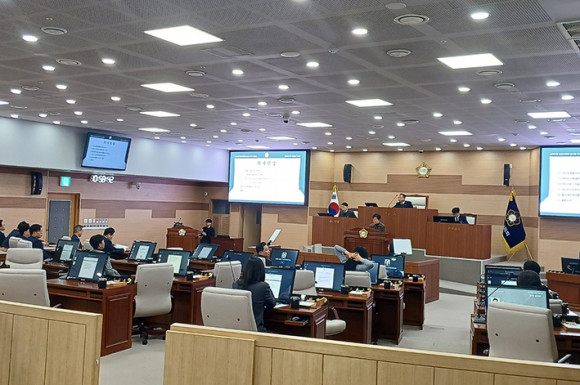 4ÀÏ °³È¸ÇÑ ¾Æ»ê½ÃÀÇȸ Á¦264ȸ ÀÓ½Ãȸ 1Â÷º»ÀÇ¿¡¼ ¡®Ãæ³²-´ëÀü ÇàÁ¤ÅëÇÕ ÃßÁø Ã˱¸ °áÀǾÈ'À» ó¸®ÇÏ´Â °úÁ¤¿¡¼ ±¹¹ÎÀÇÈû ¼Ò¼Ó ½ÃÀÇ¿øµéÀÌ ÀÏÁ¦È÷ ÅðÀåÇØ ¹ÝÂÊÂ¥¸® °áÀǾÈÀ¸·Î Àü·«µÆ´Ù.