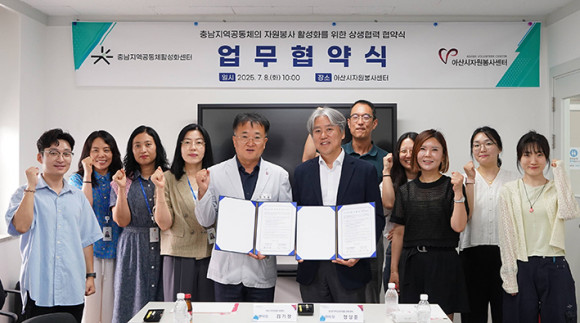ÃæÃ»³²µµÁö¿ª°øµ¿Ã¼È°¼ºÈ¼¾ÅÍ(¼¾ÅÍÀå Á¤»óÈÆ)´Â 7¿ù 8ÀÏ ¾Æ»ê½ÃÀÚ¿øºÀ»ç¼¾ÅÍ(¼¾ÅÍÀå ±è±ââ)¿Í Ãæ³²Áö¿ª°øµ¿Ã¼ÀÇ ÀÚ¿øºÀ»ç Ȱ¼ºÈ¸¦ À§ÇÑ »ó»ýÇù·Â Çù¾àÀ» ü°áÇß´Ù°í ¹àÇû´Ù.