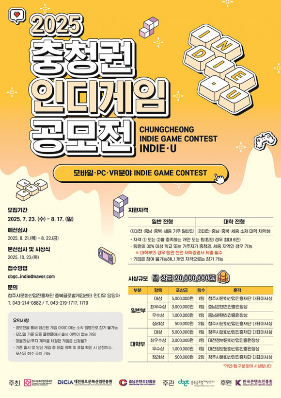 ÃæÃ»±Ç Áö¿ª °ÅÁ¡±â°üÀÎ ´ëÀü¹®È»ê¾÷ÁøÈï¿ø, Ãæ³²ÄÜÅÙÃ÷ÁøÈï¿ø°ú Çù·ÂÇØ ÁøÇàÇÏ´Â À̹ø °ø¸ðÀüÀº 2023³â ½ÃÀÛÇØ ¿ÃÇØ 3ȸ°·Î, ÃæÃ»±Ç¿ª¿¡¼ Ȱµ¿ ÁßÀÎ °ÔÀÓ °³¹ßÀÚµéÀÇ Ã¢ÀÇÀûÀÌ°í µ¶Ã¢ÀûÀÎ °ÔÀÓÀ» ¹ß±¼Çϰí, ³ª¾Æ°¡ ÃæÃ»±ÇÀÌ Àεð°ÔÀÓ °³¹ßÀÚ ³×Æ®¿öÅ©ÀÇ Çãºê°¡ µÇ°íÀÚ ÃßÁøµÆ´Ù.
