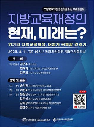 Àü±¹½Ãµµ±³À°°¨ÇùÀÇȸ(ȸÀå °ÀºÈñ ´ë±¸±¤¿ª½Ã±³À°°¨, ÀÌÇÏ ÇùÀÇȸ)´Â 8¿ù 11ÀÏ(¿ù) ¼¿ï ±¹È¸ÀÇ¿øÈ¸°ü Á¦9°£´ãȸÀǽǿ¡¼ ¡®Áö¹æ±³À°ÀçÁ¤ÀÇ ÇöÀç, ¹Ì·¡´Â?¡¯À̶ó´Â ÁÖÁ¦·Î Åä·Ðȸ¸¦ °³ÃÖÇß´Ù.
