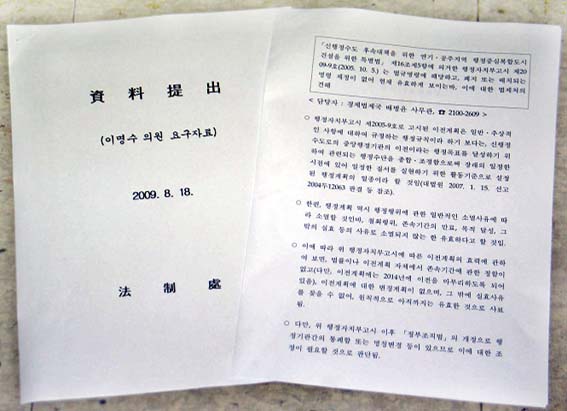 ¼¼Á¾Æ¯º°ÀÚÄ¡½ÃÀÇ Á¤ºÎ°í½Ã¿Í °ü·ÃÇØ, Áö³ 2005³âÀÇ ±âÁ¸ Á¤ºÎ ºÎóÀÌÀü °í½Ã°¡ ¹ýÀûÀ¸·Î ¿©ÀüÈ÷ À¯È¿ÇÏ´Ù´Â »ç½ÇÀÌ °ø½ÄÀûÀ¸·Î È®ÀεƴÙ. À̸í¼ö ÀÇ¿øÀÌ °ø½Ä ÁúÀÇÇϰí, ¹ýÁ¦Ã³°¡ Áö³ 8¿ù 19ÀÏ¿¡ °ø½Ä Å뺸ÇÑ ´äº¯¼¿¡ µû¸£¸é, ¡°¡®½ÅÇàÁ¤¼öµµ ÈļӴëÃ¥À» À§ÇÑ ¿¬±â¤ý°øÁÖÁö¿ª ÇàÁ¤Á߽ɺ¹ÇÕµµ½Ã °Ç¼³À» À§ÇÑ Æ¯º°¹ý¡¯ Á¦16Á¶Á¦5Ç׿¡ ÀǰÅÇÑ ÇàÁ¤ÀÚÄ¡ºÎ°í½Ã Á¦2009-9È£(2005³â 10¿ù 5ÀÏ)¿¡ µû¸¥ ÀÌÀü°èȹÀÇ È¿·Â¿¡ °üÇØ º¸¸é, ¹ý·üÀ̳ª ÀÌÀü°èȹ ÀÚü¿¡¼ Á¸¼Ó±â°£¿¡ °üÇÑ Á¤ÇÔÀÌ ¾ø°í(´Ù¸¸, ÀÌÀü°èȹ¿¡´Â 2014³â¿¡ ÀÌÀüÀ» ¸¶¹«¸®Çϵµ·Ï µÅ ÀÖÀ½), ÀÌÀü°èȹ¿¡ ´ëÇÑ º¯°æ°èȹÀÌ ¾øÀ¸¸ç, ±× ¹Û¿¡ ½ÇÈ¿»çÀ¯¸¦ ãÀ» ¼ö ¾ø¾î, ¿øÄ¢ÀûÀ¸·Î ¾ÆÁ÷±îÁö´Â À¯È¿ÇÑ °ÍÀ¸·Î »ç·áµÈ´Ù.¡±°í ¹àÈ÷°í ÀÖ´Ù. ¶ÇÇÑ, ¹ýÁ¦Ã³´Â ¡°ÇàÁ¤ÀÚÄ¡ºÎ°í½Ã Á¦2005-9È£·Î °í½ÃµÈ ÀÌÀü°èȹÀº ÀϹݤýÃß»óÀûÀÎ »çÇ׿¡ ´ëÇØ ±ÔÁ¤ÇÏ´Â ÇàÁ¤±ÔÄ¢À̶ó Çϱ⠺¸´Ù´Â, ½ÅÇàÁ¤¼öµµ·ÎÀÇ Áß¾ÓÇàÁ¤±â°üÀÇ ÀÌÀüÀ̶ó´Â ÇàÁ¤¸ñÇ¥¸¦ ´Þ¼ºÅ° À§ÇØ °ü·ÃµÇ´Â ÇàÁ¤¼ö´ÜÀ» Á¾ÇÕ¤ýÁ¶Á¤ÇÔÀ¸·Î½á Àå·¡ÀÇ ÀÏÁ¤ÇÑ ½ÃÁ¡¿¡ ÀÖ¾î ÀÏÁ¤ÇÑ Áú¼¸¦ ½ÇÇöÇϱâ À§ÇÑ È°µ¿±âÁØÀ¸·Î ¼³Á¤µÈ ÇàÁ¤°èȹÀÇ ÀÏÁ¾À̶ó ÇÒ °ÍÀ̸ç(´ë¹ý¿ø 2007³â 1¿ù 15ÀÏ ¼±°í 2004µÎ12063 ÆÇ°á µî ÂüÁ¶), ÇàÁ¤°èȹ ¿ª½Ã ÇàÁ¤ÇàÀ§¿¡ °üÇÑ ÀϹÝÀûÀÎ ¼Ò¸ê»çÀ¯¿¡ µû¶ó ¼Ò¸êÇÒ °ÍÀιÙ, öȸÇàÀ§, Á¸¼Ó±â°£ÀÇ ¸¸·á, ¸ñÀû ´Þ¼º, ±× ¹ÛÀÇ ½ÇÈ¿ µîÀÇ »çÀ¯·Î ¼Ò¸êµÇÁö ¾Ê´Â ÇÑ À¯È¿ÇÏ´Ù¡±°í ¹ýÀû È¿·ÂÀ» °®´Â ÆÇ·Ê¿Í ¼³¸íÀ» µ¡ºÙÀ̰í ÀÖ´Ù. À̸í¼ö ÀÇ¿ø¿¡°Ô Á¦ÃâÇÑ ¹ýÁ¦Ã³ÀÇ ¡®±âÁ¸ Á¤ºÎºÎóÀÌÀü °í½ÃÀÇ ¹ýÀû È¿·Â À¯Áö¡¯ ´äº¯Àº ±×µ¿¾È ÀϺο¡¼ ¼¼Á¾Æ¯º°ÀÚÄ¡½Ã¿Í °ü·ÃÇÑ ±âÁ¸ Á¤ºÎ°í½ÃÀÇ ¹ýÀû È¿·Â¿©ºÎ¿¡ ´ëÇÑ ³í¶õÀ» Á¾½Ä½ÃŰ´Â °ÍÀ» ÀǹÌÇÏ´Â °ÍÀÌ µÆ´Ù. ³ª¾Æ°¡ ¹ýÁ¦Ã³´Â ÃÖ±Ù ¼¼Á¾Æ¯º°ÀÚÄ¡½Ã °Ç¼³°ú °ü·ÃÇÑ ÀÚÀ¯¼±Áø´çÀ» ºñ·ÔÇÑ ¾ß´çÀÇ ÀϰüµÈ ¡®º¯°æ°í½Ã ÀÌÇàÃ˱¸°Ç¡¯°ú °ü·ÃÇÑ Àǰߵµ Á¦½ÃÇϰí Àִµ¥, ¡°(2005³â)ÇàÁ¤ÀÚÄ¡ºÎ°í½Ã ÀÌÈÄ ¡®Á¤ºÎÁ¶Á÷¹ý¡¯ÀÇ °³Á¤À¸·Î ÇàÁ¤±â°ü°£ÀÇ ÅëÆóÇÕ ¶Ç´Â ¸íĪº¯°æ µîÀÌ ÀÖÀ¸¹Ç·Î ÀÌ¿¡ ´ëÇÑ Á¶Á¤ÀÌ ÇÊ¿äÇÒ °ÍÀ¸·Î ÆÇ´ÜµÈ´Ù.¡±°í ´äº¯Çϰí ÀÖ´Ù. ÀÌ´Â ÇàÁ¤¾ÈÀüºÎ¿¡ ÀÇÇÑ ¡®º¯°æ°í½Ã¡¯ÀÇ ÀÌÇà »çÀ¯°¡ ¹ß»ýÇßÀ½À» ¸»ÇÏ´Â °ÍÀ¸·Î, ÇàÁ¤¾ÈÀüºÎÀÇ ¡®º¯°æ°í½Ã ÀÌÇ࡯À» ÁÖ¹®Çϰí ÀÖ´Â °ÍÀ¸·Î ÇØ¼®µÈ´Ù. ÀÌ¿¡ ´ëÇØ ÀÌ ÀÇ¿øÀº ¡°±×µ¿¾È ¿ì¸®°¡ ¼¼Á¾½Ã¿Í °ü·ÃÇÑ Á¤ºÎÀÇ º¯°æ°í½Ã ÀÌÇàÀ» ÁÙ±âÂ÷°Ô ¿ä±¸ÇØ ¿Â °ÍÀº Á¤±ÇÀÌ ¹Ù²î°í À̸í¹Ú Á¤ºÎ°¡ µé¾î¼¸é¼ ¡®º¯°æ°í½Ã¡¯¸¦ ÇÏÁö ¾ÊÀ¸¸é, ¼¼Á¾Æ¯º°ÀÚÄ¡½Ã·ÎÀÇ ¡®Á¤ºÎ ºÎóÀÌÀü °í½Ã¡¯°¡ ¹«È¿ÈµÇ±â ¶§¹®ÀÌ ¾Æ´Ï¾ú´Ù. ³ë¹«Çö Àü ´ëÅë·ÉÀº ¹°·ÐÀ̰í À̸í¹Ú ´ëÅë·Éµµ ´ë¼±Èĺ¸½ÃÀý¿¡ 10¿© Â÷·ÊÀÌ»ó ¼¼Á¾½Ã¸¦ ¼¼°èÀû ¸íǰµµ½Ã·Î ¸¸µé°Ú´Ù°í °ø½ÄÀûÀ¸·Î ¾à¼ÓÇÑ »ç½ÇÀÌ ÀÖ´Ù. ÃÖ±Ù¿¡µµ ¡®¿ø¾È´ë·ÎÀÇ ÃßÁø¡¯À» ¹àÈù ¹Ù¿Í °°ÀÌ, À̸í¹Ú ´ëÅë·ÉÀÇ °ÇÑ ÀÇÁö¸¦ ½ÇõÀ¸·Î º¸¿© ´Þ¶ó´Â Â÷¿ø¿¡¼ ¡®º¯°æ°í½ÃÀÇ Áöü ¾ø´Â ÀÌÇ࡯À» °è¼Ó ¿ä±¸ÇØ ¿Â °ÍÀÌ´Ù. ¶ÇÇÑ ¡®º¯°æ°í½Ã¡¯ÀÇ ¼Ò°üºÎóÀÎ ÇàÁ¤¾ÈÀüºÎ¿¡¼µµ ´ç¿¬È÷ ÇàÁ¤ÀýÂ÷»ó ÀÌÇàÇØ¾ß ÇÒ ¾÷¹«À̱⠶§¹®¿¡ °ü·Ã¹ý¿¡ µû¶ó¼ ¡®º¯°æ°í½Ã¡¯¸¦ ÇØ ´Þ¶ó´Â °ÍÀ̰í, ¸»·Î¸¸ÀÌ ¾Æ´Ñ ÇൿÀ¸·Î º¸¿©ÁÖ´Â Á¤ºÎÀÇ ½ÇõÀÇÁö¸¦ È®ÀÎÇϰíÀÚ Çß´ø °ÍÀÌ´Ù¡±¶ó°í ±×µ¿¾ÈÀÇ °ÅµìµÈ º¯°æ°í½Ã Ã˱¸ÀÇ ¹è°æÀ» ¼³¸íÇß´Ù. ÇÑÆí, À̸í¹Ú ´ëÅë·ÉÀº Áö³ 2007³â ´ëÅë·É ¼±°Å°úÁ¤¿¡¼ ¡°Çູµµ½Ã ÇàÁ¤Á߽ɺ¹ÇÕµµ½Ã¸¦ ´õ Å©°Ô, ´õ »¡¸® ÁöÀ» °ÍÀÌ¸ç ±¹Á¦°úÇкñÁî´Ï½ºº§Æ®(ÁßÀ̿°¡¼Ó±â ¼³Ä¡)¸¦ Ãß°¡ÇØ ÀÚÁ·¼ºÀ» º¸¿ÏÇÑ ¡®À̸í¹ÚÇ¥ ¼¼Á¾½Ã¡¯¸¦ ¼¼°èÀûÀÎ ¸íǰµµ½Ã·Î °Ç¼³ÇϰڴÙ.¡±°í °ø¾àÇÑ ¹Ù ÀÖ´Ù.