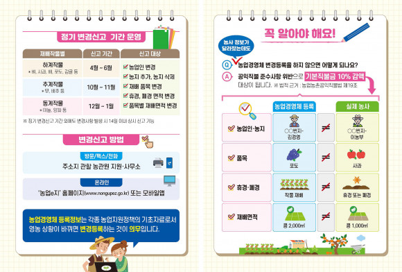 ±¹¸³³ó»ê¹°Ç°Áú°ü¸®¿ø(¿øÀå ±èö, ÀÌÇÏ ³ó°ü¿ø)Àº ³ó¾÷°æ¿µÃ¼ µî·ÏÁ¤º¸ÀÇ Á¤È®¼º Á¦°í¿Í ³ó¾÷ÀÎ ºÒÀÌÀÍ ¹æÁö¸¦ À§ÇØ ¡®ÇϰèÀÛ¹° Á¤±â º¯°æ½Å°í ±â°£¡¯À» ¿î¿µÇÑ´Ù.