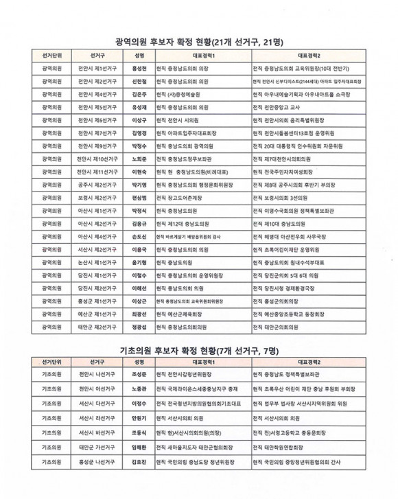 ±¹¹ÎÀÇÈû Ãæ³²µµ´ç °øÃµ°ü¸®À§¿øÈ¸(ÀÌÇÏ °ø°üÀ§)´Â Á¦9ȸ Àü±¹µ¿½ÃÁö¹æ¼±°Å Ãæ³² ±¤¿ªÀÇ¿ø 21°³ ¼±°Å±¸ ´Üµ¶ ½ÅûÇÑ 21¸í Èĺ¸ÀÚ¿Í ±âÃÊÀÇ¿ø 7°³ ¼±°Å±¸ ´Üµ¶ ½ÅûÇÑ 7¸í Èĺ¸¿¡ ´ëÇÑ °øÃµÀ» È®Á¤Çß´Ù.