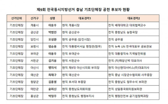 ÇÑÆí ±¹¹ÎÀÇÈû Ãæ³²µµ´ç °øÃµ°ü¸®À§¿øÈ¸(ÀÌÇÏ °ø°üÀ§)´Â Á¦9ȸ Àü±¹µ¿½ÃÁö¹æ¼±°Å ±âÃÊ´ÜüÀå 11°³ ¼±°Å±¸ Èĺ¸ÀÚ 11¸íÀÇ °øÃµÀ» È®Á¤Çß´Ù.