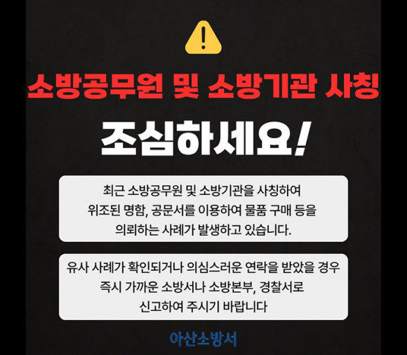 ¾Æ»ê¼Ò¹æ¼­(¼­Àå ¹ÚÁ¾ÀÎ)´Â ÃÖ±Ù ¼Ò¹æ±â°ü ¹× ¼Ò¹æ°ø¹«¿øÀ» »çĪÇÑ ¹°Ç° ±¸¸Å ¿ä±¸ µî °¢Á¾ »ç±â ÇÇÇØ »ç·Ê°¡ ¹ß»ýÇÔ¿¡ µû¶ó ½Ã¹ÎµéÀÇ °¢º°ÇÑ ÁÖÀǸ¦ ´çºÎÇß´Ù.