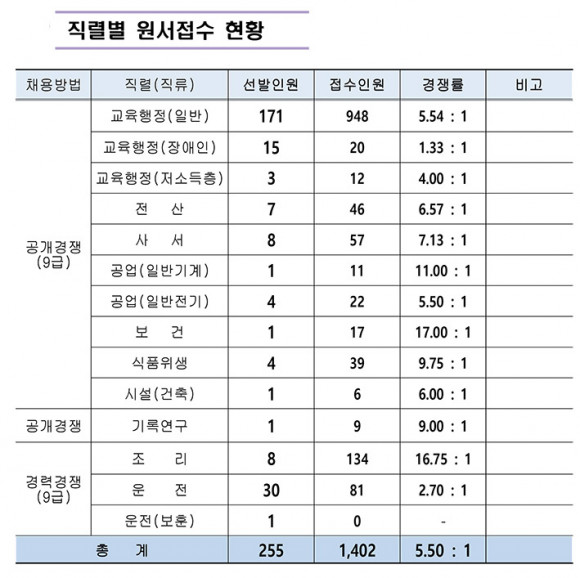 Á÷·Äº°·Î´Â ¡ã±³À°ÇàÁ¤(ÀϹÝ) 9±ÞÀº 171¸í ¸ðÁý¿¡ 948¸í(5.54´ë1), ¡ã±³À°ÇàÁ¤(Àå¾ÖÀÎ) 9±ÞÀº 15¸í ¸ðÁý¿¡ 20¸í(1.33´ë1), ¡ã±³À°ÇàÁ¤(Àú¼Òµæ) 9±ÞÀº 3¸í ¸ðÁý¿¡ 12¸í(4.0´ë1), ¡ãÀü»ê 9±ÞÀº 7¸í ¸ðÁý¿¡ 46¸í(6.57´ë1), ¡ã»ç¼ 9±ÞÀº 8¸í ¸ðÁý¿¡ 57¸í(7.13´ë1),