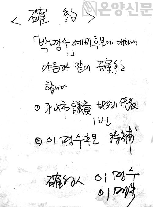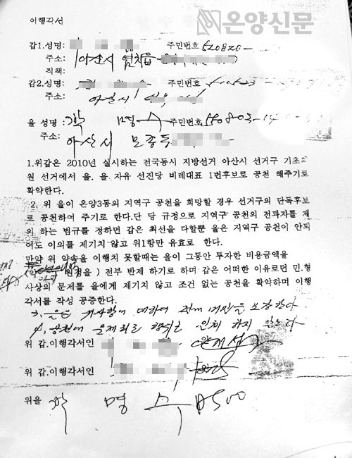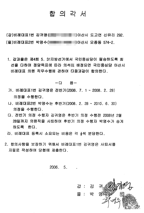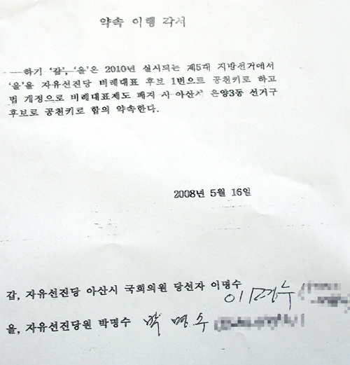 2008³â 6¿ù¿¡´Â 2010³â À̹ø ¼±°Å¿¡ ºñ·Ê´ëÇ¥ 1¹øÀ» °øÃµÇϱâ·Î ÇÏ°í ¸¸¾à ¾à¼ÓÀ» ÀÌÇàÄ¡ ¾ÊÀ¸¸é À»(¹Ú¸í¼ö)ÀÌ ÅõÀÚÇÑ ºñ¿ë±Ý¾×(ÀÌ¾ï¿øÁ¤À̶ó ½èÀ½)À» ÀüºÎ º¯Á¦(¿ø¹®¿¡´Â ¹ÝÁ¦. ¿ÀÀÚÀÎ µíÇÔ) ÇÏ°í ¾î¶² ÀÌÀǵµ Á¦±âÇÏÁö ¾Ê±â·Î È®¾àÇϰí ÀÌÇà °¢¼¸¦ ÁÖ°í¹ÞÀº °ÍÀ¸·Î ¹àÇôÁ³´Ù. ´õ¿í ¼·Î´Â ÀÌ °°Àº ³»¿ëÀ» Àý´ë ºñ¹Ð·Î ÇÑ´Ù´Â ³»¿ë±îÁö ´ã°í ÀÖ´Ù.