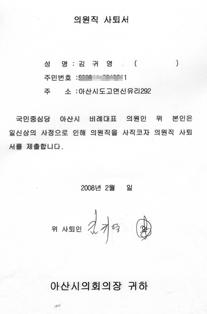 | ¡ã2008³â 2¿ù¿¡ »çÁ÷ÇÑ´Ù´Â ±è±Í¿µ½ÃÀÇ¿øÀÇ »çÅð¼ (¾Æ»ê½ÃÀÇȸ, ¼±°üÀ§, ±¹¹ÎÁ߽ɴ翡 Á¦ÃâÇÏ´Â 3°³ÀÇ »çÅð¼¿Í ±¹¹ÎÁ߽ɴç Å»´ç°è, ÀÌ ¼·ù¸¦ Á¢¼öÇÑ ÀÚÀ¯¼±Áø´çÀÇ Á¢¼öÁõÀÌ ÀÖ´Ù) |