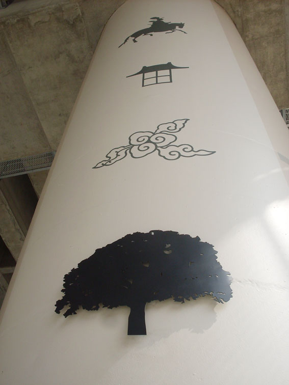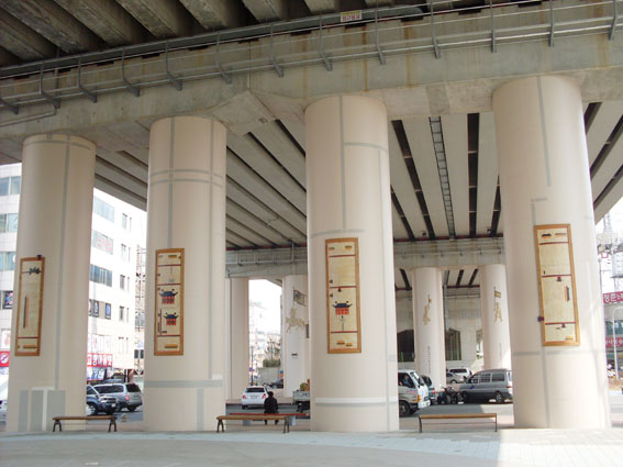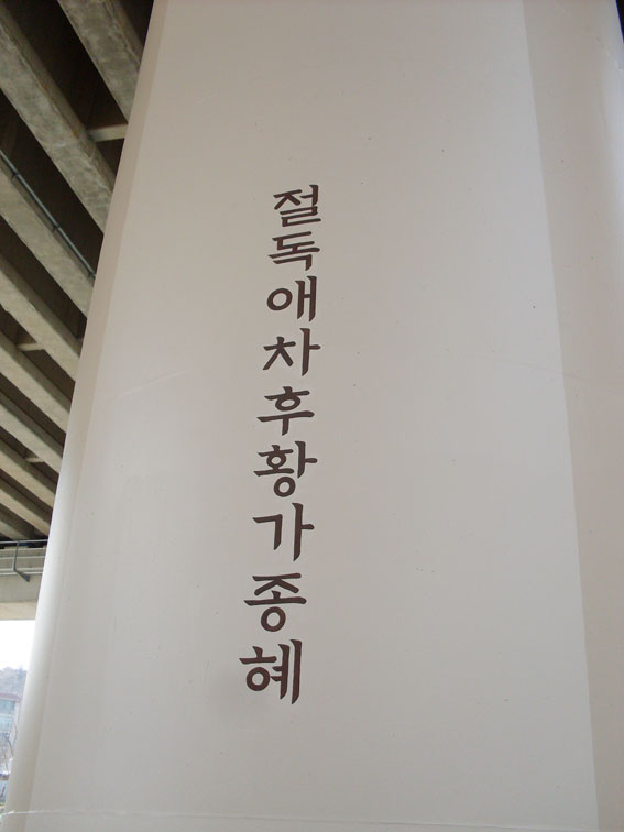 °ú°Å ±¼´Ù¸® ¾Æ·¡ Àüö ±³°¢¿¡ ÀÌ»ö Àå½ÄÀÌ »õ°ÜÁ³´Ù. ºÎÁ¶ ÇüÅÂÀÇ Á¶°¢¹°µµ ÀÖ°í, ¾×ÀÚ ÇüÅÂÀÇ ¿Â±Ãµµ¿Í º®Èµµ »õ°Ü ³Ö¾îÁ³´Ù. ĢĢÇÑ ½Ã¸àÆ® ÇüÅÂÀÇ ±âµÕº¸´Ù ÈξÀ º¸±â ÁÁ¾Æ º¸ÀδÙ. ±×·±µ¥ Àü¸éºÎ¿¡ »õ°ÜÁø ÇѱۺκÐÀ» º¸°í Áö³ª´Â ½Ã¹ÎµéÀÌ °í°³¸¦ °¼¿ô°Å¸®´Â °ÍÀ» ÀÚÁÖ ¸ñ°ÝÇÏ°Ô µÈ´Ù. ¡°»ê¶æÇؼ ÁÁ±â´Â Çѵð, ´ëü ¹¹¶ó°í ½á³õÀº °Ü?¡± ºñ¸í °°±âµµ Çϰí, ¿ª»ç¼¿¡¼ ¹ßÃéÇÑ ±Û °°±âµµ Çѵ¥ ÇÑÀÚÀÇ À½¸¸À» Çѱ۷Π¶°¿Í »õ°Ü³õ°í º°´Ù¸¥ ÇØ¼³À̳ª ¿ø·¡ ÇÑÀÚ Ç¥±âµµ ¾øÀ¸´Ï µµ¹«Áö ¹«½¼ ±ÛÀÎÁö ¾Ë ¼ö°¡ ¾ø´Ù. ÇÑ±Û ±ÛÀÚ ¿·¿¡ Á¶±×¸Ä°Ô ÇÑÀÚ¸¦ ºÎ±âÇϵçÁö ÇØ¼³À» ´Þ¾Æ¾ß ÀÌÇØ°¡ °¡´ÉÇÒ °ÍÀ¸·Î º¸ÀδÙ. <ÀÓÀç·æ ±âÀÚ>