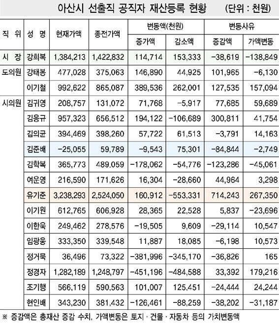 Ãæ³²µµ°øÁ÷ÀÚÀ±¸®À§¿øÈ¸(À§¿øÀå ±è¼º´ë)´Â °øÁ÷ÀÚÀ±¸®¹ý Á¦10Á¶ Á¦1Ç×ÀÇ ±ÔÁ¤¿¡ ÀÇÇØ Ãæ³²µµ°³¹ß°ø»ç »çÀå ¹× ½Ã¡¤±ºÀÇȸ ÀÇ¿ø 173¸í¿¡ ´ëÇÑ 2009³âµµ 1³â°£ÀÇ Àç»êº¯µ¿½Å°í ³»¿ªÀ» °ø°³Çß´Ù. °ø°³µÈ ÀÚ·á¿¡ µû¸£¸é ¾Æ»ê½ÃÀÇ¿ø Áß °¡Àå Àç·Â°¡(?)´Â ¿¹³âó·³ À¯±âÁØ ÀÇ¿øÀ¸·Î ³ªÅ¸³µ´Ù. À¯ ÀÇ¿øÀº ¸ðµÎ 32¾ï3õ829¸¸3õ¿øÀ» µî·ÏÇØ ¾Æ»ê½ÃÀÇ¿øÁß 1À§´Â ¹°·Ð µµ³» ½Ã¡¤±ºÀÇ¿ø µî 173¸í Áß¿¡¼µµ 5À§¸¦ ±â·ÏÇß´Ù. À¯ ÀÇ¿øÀÇ Àç»êÀº ´ëºÎºÐ Àü´ä µîÀÌ´Ù. À¯ ÀÇ¿øÀº Àç»ê°¡¾× Áõ°¨½Å°í¿¡¼µµ »óÀ§ÀÚ¿¡ ¼ÓÇϰí ÀÖ´Ù. Àüü 173¸íÁß 7¾ï1õ424¸¸3õ¿øÀÌ Áõ°¡ÇØ 2À§¸¦ ±â·ÏÇßÀ¸¸ç Áõ°¡ »çÀ¯´Â ºÎµ¿»ê Æò°¡¾× »ó½Â°ú ±ÝÀ¶±â°ü 乫 °¨¼Ò ¶§¹®À̶ó°í ¹àÇû´Ù. Àç»ê°¡¾× Áõ°¨½Å°í Ç׸ñ¿¡¼´Â ±èÀÀ±Ô ½ÃÀÇ¿øµµ »óÀ§¿¡ ¿Ã¶ó ÀÖ¾î ´«±æÀ» ²ö´Ù. ±è ÀÇ¿øÀº 3¾ï81¸¸1õ¿øÀÌ Áõ°¡Çß´Ù°í ½Å°íÇØ Àüü 5À§¿¡ ¿Ã¶ó Àִµ¥ ±è ÀÇ¿øÀÇ ÃÑ Àç»êÀº 9¾ï5õ732¸¸3õ¿øÀ¸·Î ÀÚµ¿Â÷ ±¸ÀÔ ¹× 乫»óȯÀ¸·Î ÃѾ×ÀÌ Áõ°¡Çß´Ù°í ¹àÇû´Ù. ¾Æ»ê½ÃÀÇ¿ø Áß À¯±âÁØ ÀÇ¿ø¿¡ À̾î 2À§´Â Á¤°æÀÚ ÀÇ¿ø(12¾ï8õ218¸¸9õ¿ø), 3À§´Â ±èÀÀ±Ô ÀÇ¿ø, 4À§´Â ÀÌ±â¿ø ÀÇ¿ø(6¾ï1õ276¸¸5õ¿ø), 5À§´Â Á¶±âÇà ÀÇ¿ø(5¾ï6õ611¸¸9õ¿ø)À¸·Î ³ªÅ¸³µ´Ù. ¹Ý¸é ÃÖÀú½Å°í¾×Àº ±èÁعè ÀÇ¿øÀ¸·Î -2õ505¸¸5õ¿ø, À̾î Á¤°Å¹¬ ÀÇ¿øÀÌ 3õ649¸¸6õ¿øÀ¸·Î µÎ¹øÂ°, ±è±Í¿µ ÀÇ¿øÀÌ 2¾ï875¸¸7õ¿øÀ¸·Î ¼¼¹øÂ°¸¦ ³ªÅ¸³Â´Ù. Àç»êÁõ°¡¾×ÀÌ ³ôÀº ÀÇ¿øÀº À¯±âÁØ-±èÀÀ±Ô ÀÇ¿ø ¿Ü¿¡ ±è±Í¿µ(7õ768¸¸5õ¿ø Áõ°¡), ¿©¿î¿µ(4õ296¸¸4õ¿ø Áõ°¡), Á¤°æÀÚ(3õ339¸¸2õ¿ø Áõ°¡) ÀÇ¿øÀÇ ¼øÀ¸·Î ³ªÅ¸³µÀ¸¸ç ¹Ý¸é °¡Àå ¸¹ÀÌ °¨¼ÒÇÑ ÀÇ¿øÀº ±èÇк¹(-1¾ï2õ328¸¸6õ¿ø), ±èÁعè(-8õ484¸¸4õ¿ø), ÇöÀιè(-3õ820¸¸2õ¿ø), Á¤°Å¹¬(-3õ682¸¸6õ¿ø), Á¶±âÇà(-2õ444¸¸4õ¿ø) ÀÇ¿øÀÇ ¼øÀ¸·Î ³ªÅ¸³µ´Ù. °Èñº¹ ½ÃÀåÀº 13¾ï8õ421¸¸3õ¿øÀ» ½Å°íÇØ Àü³âµµ(14¾ï2õ283¸¸2õ¿ø)¿¡ ºñÇØ 3õ861¸¸9õ¿øÀÌ °¨¼ÒÇß´Ù. °ÅºÀ µµÀÇ¿øÀº 4¾ï7õ702¸¸8õ¿øÀ¸·Î Áö³ÇØ(3¾ï7õ506¸¸3õ¿ø) º¸´Ù 1¾ï296¸¸5õ¿øÀÌ Áõ°¡Çß´Ù°í ½Å°íÇß´Ù. º¯µ¿»çÀ¯·Î´Â ÅýÃȸ»ç ÀÌÀ͹è´ç ¹× ¿¹±ÝÀÌÀÚ¼öÀÍ µîÀ» µé¾ú´Ù. À̱âö µµÀÇ¿øÀº 9¾ï9õ262¸¸2õ¿øÀ¸·Î Áö³ÇØ(8¾ï6õ508¸¸7¿ø) º¸´Ù 1¾ï2õ753¸¸5õ¿ø Áõ°¡ÇßÀ¸¸ç ÁÖ¿ä º¯µ¿»çÀ¯´Â °Ç¹°(â°í) µîÀÇ °¡¾×º¯µ¿ ¶§¹®ÀÌ´Ù. À̹ø¿¡ °ø°³ÇÑ Á¤±â Àç»êº¯µ¿»çÇ×Àº °øÁ÷ÀÚÀ±¸®¹ý Á¦6Á¶ ¹× Á¦10Á¶ÀÇ ±ÔÁ¤¿¡ ÀÇÇØ ¸Å³â 1¿ù 1ÀÏ(ÃÖÃÊ µî·ÏÀǹ«ÀÚ·Î µÈ ³¯)ºÎÅÍ 12¿ù 31ÀϱîÁöÀÇ Àç»êº¯µ¿»çÇ×À» ´ÙÀ½ÇØ 2¿ù¸»±îÁö ½Å°íÇØ¾ß Çϸç, ½Å°í ÈÄ 1°³¿ù À̳»¿¡ Àç»êº¯µ¿½Å°í ³»¿ªÀ» °ø°³ÇÏ°í °ø°³ÇÑ ÈÄ 3¿ù À̳»¿¡ °ø°³´ë»óÀÚ Àü¿ø¿¡ ´ëÇÑ ½É»ç¸¦ ¿Ï·áÇØ¾ß ÇÏ´Â ±ÔÁ¤¿¡ µû¸¥ °ÍÀÌ´Ù. °ø°³´ë»óÀÚÀÇ Àç»êº¯µ¿»çÇ׿¡ ´ëÇØ¼´Â 6¿ù¸»±îÁö °øÁ÷ÀÚÀ±¸®À§¿øÈ¸ÀÇ ½É»ç¸¦ ¹Þ°Ô µÇ¸ç, Àç»ê½É»ç °á°ú ºÒ¼º½Ç ½Å°í»ç½ÇÀÌ ¹ß°ßµÇ¸é ±× °æÁß¿¡ µû¶ó °æ°í, °úÅÂ·á ºÎ°ú, ÇØÀÓ¡¤Â¡°è ¿ä±¸ µîÀÇ Á¶Ä¡¸¦ ÃëÇÏ°Ô µÈ´Ù. ¶Ç, °øÁ÷À» ÀÌ¿ëÇÑ ºÎÁ¤ÇÑ Àç»êÁõ½Ä ÀÇȤÀÌ ÀÖ´Â °øÁ÷ÀÚ¿¡ ´ëÇØ¼´Â °ü°è±â°ü¿¡ ´Ù¸¥ ¹ý·É À§¹Ý»çÇ׿¡ ´ëÇÏ¿© Á¶»ç¸¦ ÀÇ·ÚÇÑ´Ù. <ÀÓÀç·æ ±âÀÚ>