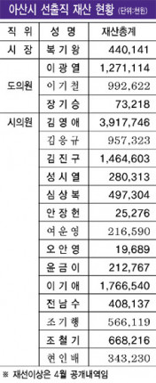 ½Å±Ô µî·Ï´ë»óÀÎ ½ÃÀå°ú µµÀÇ¿ø 2¸íÀÇ Àç»êÃѾ×Àº 17¾ï8õ447¸¸¿øÀÌ°í Æò±ÕÀº 5¾ï9õ482¸¸¿øÀÌ´Ù. ¶Ç ½ÃÀÇ¿ø 10¸íÀÇ Àç»êÃѾ×Àº 89¾ï8õ27¸¸¿øÀÌ°í Æò±ÕÀº 8¾ï9õ802¸¸¿øÀ¸·Î ³ªÅ¸³µ´Ù. À̵éÀÇ Àüü ÃѾ×Àº 107¾ï6õ475¸¸¿øÀ̾úÀ¸¸ç Æò±ÕÀº 8¾ï2õ895¸¸¿øÀ̾ú´Ù.