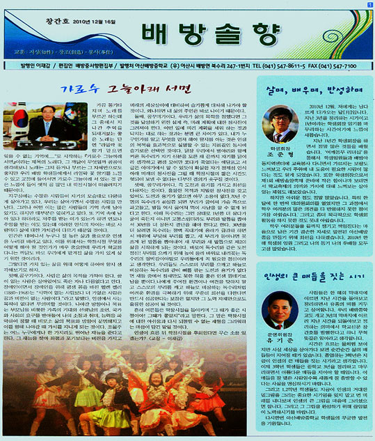 ¾Æ»ê¹èÁßÇб³(±³Àå ÀÌÀç°©)´Â Áö³ 12¿ù 16ÀÏ °³±³ 3³â ¸¸¿¡ óÀ½À¸·Î Çб³½Å¹® ¡®¹è¹æ¼ÖÇ⡯ Ⱓȣ¸¦ ¹ßÇàÇß´Ù.