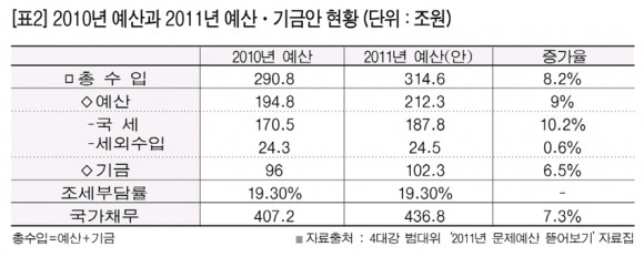 ¹Ý¸é Á¤ºÎ´Â 9Á¶5õ895¾ï¿ø(¼ö°øºÎ´ãºÐ 3Á¶ 8õ¾ï¿ø Æ÷ÇÔ)ÀÇ 2011³â 4´ë° »ç¾÷ ¿¹»êÀ» È®Á¤Çß´Ù. 2010³â ´ëºñ ¾à 17%°¡ ´Ã¾î³ ±Ý¾×ÀÌ´Ù. ¼öÀÚ¿ø°ø»ç ºÎ´ãºÐÀ» Á¦¿ÜÇØµµ 2010³â ¿¹»êº¸´Ù ¹«·Á 7õ693¾ï¿øÀÌ ´Ã¾î³µ´Ù. ±¹ÅäÇØ¾çºÎ°¡ ±¹°¡ÇÏõÁ¤ºñ »ç¾÷À¸·Î ¼öÀÚ¿ø¿¡ Æí¼ºÇÑ 3Á¶2õ800¾ï¿ø°ú ¼öÀÚ¿ø°ø»ç ±ÝÀ¶ºñ¿ë º¸Àü¾× 2õ550¾ï¿ø, ȯ°æºÎ°¡ »óÇϼöµµ¿Í ¼öÁúº¸Àü°ü¸®¿¡ Æí¼ºÇÑ 1Á¶ 467¾ï¿ø, ³ó¸²ºÎ°¡ ¿µ»ê° Çϱ¸µÏ ±¸Á¶°³¼±°ú Àú¼öÁö µÏ³ôÀÓ »ç¾÷¿¡ ¹èÁ¤ÇÑ 1Á¶1õ930¾ï¿ø, ¹®È°ü±¤ºÎ°¡ 4´ë° ¹®È°ü±¤±Ç °³¹ß ¹× ·¹Æ÷Ã÷½Ã¼³ µî¿¡ ¹èÁ¤ÇÑ 148¾ï¿ø µî ÃÑ 5Á¶4õ345¾ï¿øÀÌ´Ù.