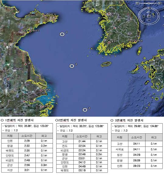 À̸í¼ö ÀÇ¿øÀº ¡°¼ÇØ¿¡¼ ÀϾ´ø °¡Àå Å« ÇØÀúÁöÁø Áö¿ª(2003³â 3¿ù Àü³² È«µµ ºÏ¼ÂÊ ¾à 50km ÇØ¿ª)¿¡¼ ¼öÄ¡¸¦ ÅëÇØ ¸ðÀǽÇÇèÀ» ÇØº» °á°ú, ÆÄ°í 0.4~0.9m·Î ¾à 90ºÐ ¼Ò¿ä ÈÄ ¼ÇØ¾È Áö¿ª¿¡ µµ´ÞÇÏ´Â °ÍÀ¸·Î ±â·ÏµÆ°í, Áß±¹ »óÇØÁö¿ª¿¡¼ Áøµµ 7.6±Ô¸ðÀÇ ÁöÁø ¹ß»ý½Ã ÀÎõ±îÁöÀÇ µµ´Þ½Ã°£Àº 10½Ã°£ Á¤µµÀÌ¸ç ÆÄ°í´Â 0.3mÀ¸·Î ±â·ÏµÆ´Ù.¡±°í ½Ã¹Ä·¹ÀÌ¼Ç °á°ú¸¦ ¹àÇû´Ù.