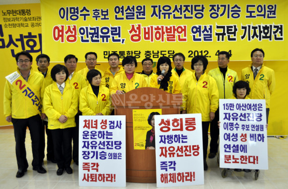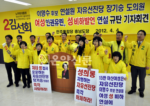 Àå±â½Â µµÀÇ¿øÀÇ ±è¼±È Èĺ¸¿¡ ´ëÇÑ ¿©¼ººñÇÏ ¹ß¾ðÀ¸·Î ¾Æ»ê½Ã Á¤°è°¡ ¶°µé½âÇÏ´Ù. ¹ÎÁÖÅëÇÕ´ç Ãæ³²µµ´ç, Ãæ³² ¿©¼ºÀ§¿øÈ¸, õ¾È․¾Æ»ê Áö¹æÀÇ¿øµéÀÌ ³ª¼¼ 4ÀÏ ¿ÀÈÄ 2½Ã ±âÀÚȸ°ßÀ» ¿°í ÀÚÀ¯¼±Áø´ç ÇØÃ¼¿Í À̸í¼ö Èĺ¸ÀÇ Èĺ¸Á÷ »çÅ𸦠¿ÜÃÆÀ¸¸ç, ¹Ù·Î À̾î Àå±â½Â µµÀÇ¿øÀÌ ¿ÀÈÄ 3½Ã ±âÀÚȸ°ßÀ» ¿°í Å»´ç °á½ÉÀ» ¹àÇû´Ù.