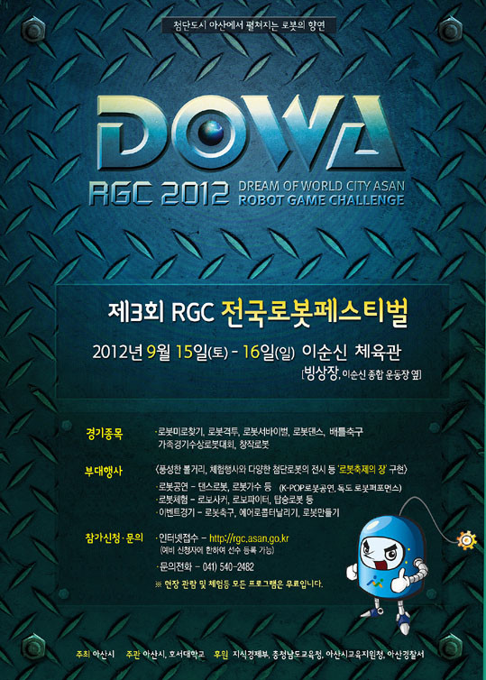| | ¡è¡è ´ëȸ ij¸¯ÅÍ | ¨Ï ¿Â¾ç½Å¹® | ¿ÃÇØ·Î ¼¼ ¹øÂ° ¸Â´Â ¡®DOWA RGC Àü±¹·Îº¿Æä½ºÆ¼¹ú(DOWA RGC : Dream Of World City Asan Robot Game Challenge)¡¯Àº ¿Â °¡Á·ÀÌ ÇÔ²²ÇÏ´Â °¡Á·Çü, Å׸¶Çü, üÇèÇнÀÇü ·Îº¿ ÃàÁ¦·Î °³ÃÖµÇ¸ç ¿ÃÇØ´Â ±×µ¿¾ÈÀÇ ¼º°ú¸¦ ÀÎÁ¤¹Þ¾Æ Áö½Ä°æÁ¦ºÎÀÇ °ø½Ä ÈÄ¿ø ´ëȸ·Î °³ÃÖÇÏ°Ô µÈ´Ù.