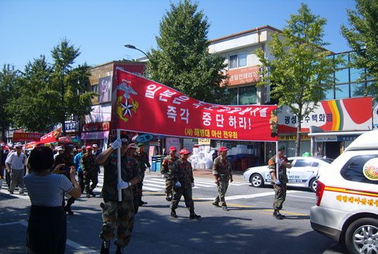 ÇÑÆí À̳¯ ±Ôź´ëȸ¸¦ ¸¶Ä£ Âü¼®ÀÚµéÀº ¡®µ¶µµ´Â ¿ì¸® ¶¥ ¿ì¸®°¡ ÁöŲ´Ù¡¯ µî ¹®±¸°¡ »õ°ÜÁø ÇÇÄϰú ¡®ÀϺ»Àº µ¶µµ ħŻ ¸¸ÇàÀ» Áï°¢ Áß´ÜÇ϶󡯴 Ç÷¡Ä«µå¸¦ ¾Õ¼¼¿ì°í ¿Â¾ç¿Âõ¿ª±¤ÀåÀ» Ãâ¹ßÇØ ½Ãû ¾Õ±îÁö ¾à 1kmÀÇ °Å¸®ÇàÁøÀ» ¹ú¿´´Ù.