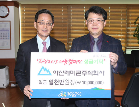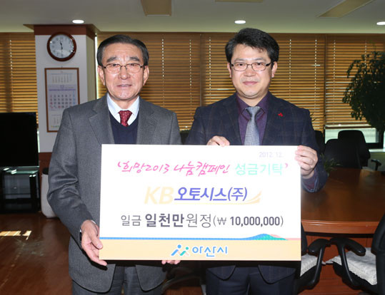Çö´ëÀÚµ¿Â÷ ¾Æ»ê°øÀå(°øÀåÀå ÀÓżø), ¾Æ»ê·¹¹ÌÄÜ(ÁÖ) ¹ÚÇѱ⠻çÀå, KB¿ÀÅä½Ã½º(ÁÖ) ±è¿ë¿õ ȸÀåÀº Áö³ 12¿ù 26ÀÏ º¹±â¿Õ ½ÃÀåÀ» ¹æ¹®ÇØ ¡®Èñ¸Á2013 ³ª´®Ä·ÆäÀÎ ÀÌ¿ôµ½±â¼º±ÝÀ» Àü´ÞÇß´Ù.