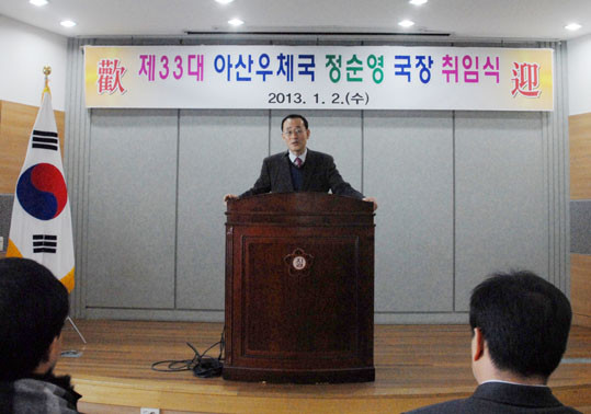 ¾Æ»ê¿ìü±¹Àº Áö³ 1¿ù 2ÀÏ ¿ÀÀü 9½Ã ¾Æ»ê¿ìü±¹ ´ëȸ½Ç¿¡¼ ¾Æ»ê¿ìü±¹ ¹× °ü³»±¹ Á÷¿ø µî 200¿© ¸íÀÌ Âü¼®ÇÑ °¡¿îµ¥ ½ÅÀÓ ¿ìü±¹ÀåÀÇ ÃëÀÓ½ÄÀ» °¡Á³´Ù.