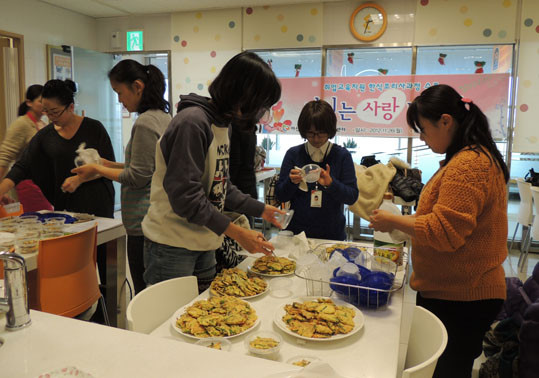 ¾Æ»ê¿¡ °ÅÁÖÇÏ´Â ´Ù¹®È ÀÌÁÖ¿©¼ºµéÀÌ e¸¶Æ® ¾Æ»êÁ¡(Á¡Àå À̺´ÁÖ)¿¡¼ 12ÁÖ°£ ½Ç½ÃÇÑ ÇѽÄÁ¶¸®»ç°úÁ¤À» ¼ö·á ÈÄ ¿ì¸® °íÀ¯ À½½ÄÁß ÇϳªÀÎ ¹ö¼¸¾ßäÀüÀ» Á÷Á¢ ¸¸µé¾î Á¤¾Ö¿ø¿¡ °ÅÁÖÇÏ´Â ¾î¸£½Åµé¿¡°Ô ¹æ¹®ÇØ Àü´ÞÇß´Ù.
