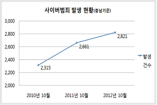 Ãæ³²Áö¹æ°æÂûû(ûÀå À±Ã¶±Ô) »çÀ̹ö¼ö»ç´ë°¡ ÃÖ±Ù 3³â°£ Ãæ³²¿¡¼ ¹ß»ýÇÑ »çÀ̹ö¹üÁË ÇöȲÀ» ºÐ¼®ÇÑ °á°ú, ¿ÃÇØ 1¿ùºÎÅÍ 10¿ù±îÁö ¹ß»ýÇÑ »çÀ̹ö¹üÁË´Â ÃÑ 2õ821°ÇÀ¸·Î 2010³â °°Àº ±â°£ 2õ315°Ç¿¡ ºñÇØ ¾à 21.9%°¡ Áõ°¡ÇÑ °ÍÀ¸·Î Á¶»çµÆ´Ù.