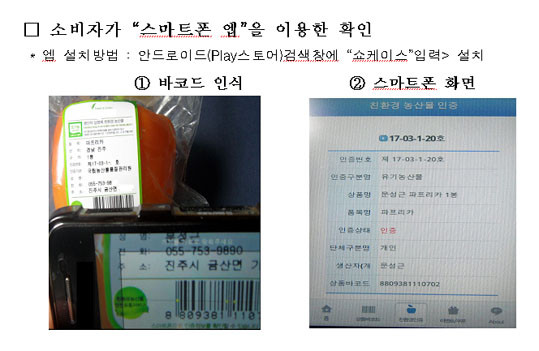 ¡®Ä£È¯°æ³ó»ê¹° ½Äº° ¹ÙÄÚµå ½Ã½ºÅÛ¡¯Àº ģȯ°æÀÎÁõ Á¤º¸¸¦ ¹ÙÄÚµåÈ ÇÏ¿© ¹°·ù¼¾ÅÍ, ÆÇ¸ÅÀå µî¿¡¼ ÈÞ´ë¿ë ´Ü¸»±â³ª ½º¸¶Æ®Æù ¾ÛÀ» ÅëÇØ ģȯ°æ ÀÎÁõ¿©ºÎ¸¦ ½Ç½Ã°£ È®ÀÎÇÒ ¼ö ÀÖ´Â ½Ã½ºÅÛÀ¸·Î °ÅÁþÇ¥½Ã³ª ÀÜ·ù³ó¾à °ËÃâ µîÀ¸·Î ÀÎÁõÀÌ Ãë¼ÒµÇ°Å³ª Ç¥½ÃÁ¤Áö óºÐÀ» ¹ÞÀº °æ¿ì Áï°¢ÀûÀÎ À¯Åë Â÷´ÜÀÌ °¡´ÉÇÏ´Ù.