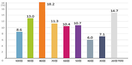 Á¡¼öº°·Î´Â 90Á¡(19.3%)¡µ80Á¡(17.7%)¡µ20Á¡ ÀÌÇÏ(13.0)¡µ70Á¡(12.0%)¡µ100Á¡(10.7%)¡µ60Á¡(9.6%)¡µ50Á¡(7.7%)¡µ40Á¡(6.2%)¡µ30Á¡(3.8%) ¼øÀ̾ú´Ù. °íÁ¡ Æò°¡´Â 47.7%, Áß°£Á¡ Æò°¡´Â 29.3%, ÀúÁ¡ Æò°¡´Â 23.0%ÀÇ ÀÀ´ä·üÀ» º¸¿´´Ù.