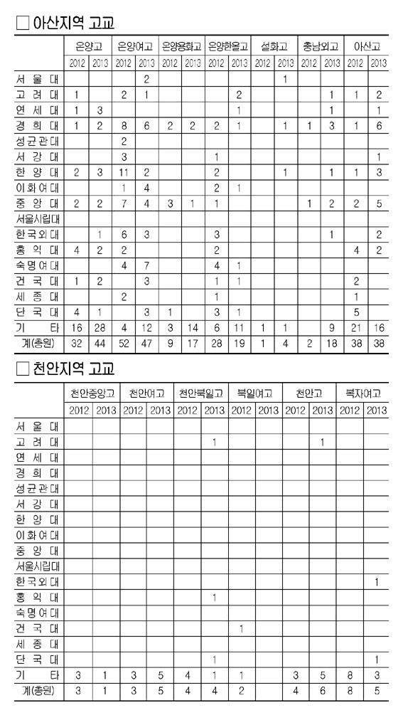 À̱âö Ãæ³²µµÀÇ¿øÀÌ Ãæ³²µµ±³À°°¨¿¡ ¿ä±¸ÇØ Á¦Ãâ ¹ÞÀº ÀÚ·á¿¡ µû¸£¸é ¾Æ»ê½Ã ÁßÇб³ Ãâ½ÅÀڷμ »óÀ§ 10%À̳» ¼ºÀûÀ¸·Î õ¾ÈÁö¿ª °í±³¿¡ ÁøÇÐÇÑ ÇлýÀÇ ¼öµµ±Ç ´ëÇб³ ÀÔÇÐÇöȲÀ» º¸¸é 2012Çг⵵¿¡´Â Àüü 26¸í Áß 1¸í, 2013Çг⵵¿¡´Â Àüü 24¸í Áß 6¸í¿¡ ºÒ°úÇÑ °ÍÀ¸·Î ³ªÅ¸³ª°í ÀÖ´Ù. °¢ 4%¿Í 25%·Î ÇÕ»êÇϸé 14%¿¡ ºÒ°úÇÏ´Ù.