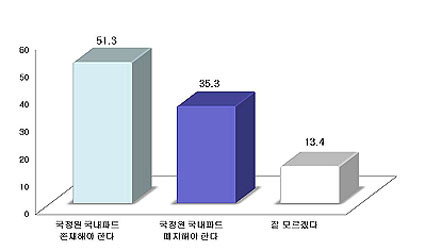 | | ¨Ï ¿Â¾ç½Å¹® | ±¹Á¤¿ø ±¹³»ÆÄÆ® Á¸Æó¿Í °ü·ÃÇØ ´ëºÏÁ¤º¸ ¹× ±¹³»¿Ü Á¤º¸ ¼öÁý µî °íÀ¯ ¾÷¹« ¼öÇà°ú ¿¬°üµÅ ÀÖÀ¸¹Ç·Î Á¸ÀçÇØ¾ß ÇÑ´Ù´Â ÀÔÀå°ú °íÀ¯¾÷¹« ¼öÇຸ´Ù °úµµÇÑ ±¹³»Á¤Ä¡ °³ÀÔÀÌ ÀÌ·ïÁö¹Ç·Î ÆóÁöÇØ¾ß ÇÑ´Ù´Â ÀÔÀåÀÌ ¸Â¼´Â °¡¿îµ¥ Á¶»çÀÀ´äÀÚÀÇ 51.3%°¡ ¡®Á¸ÀçÇØ¾ß ÇÑ´Ù¡¯°í ´äÇß´Ù. 35.3%´Â ¡®ÆóÁöÇØ¾ß ÇÑ´Ù¡¯ 13.4%´Â ¡®Àß ¸ð¸§¡¯À̶ó°í ÀÀ´äÇß´Ù.