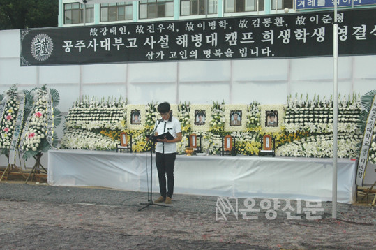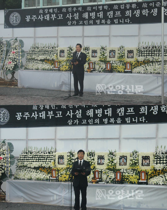 °øÁÖ»ç´ëºÎ°í´Â 7¿ù 24ÀÏ ÅÂ¾È ÇØ¾çÄ·ÇÁ Èñ»ýÇлý 5¸íÀÇ ¿µ°á½ÄÀ» ¡®Çб³Àå(í÷)¡¯À¸·Î Ä¡·¶´Ù. Àå¸Àºñ°¡ ¸¶Ä¡ ½½ÆÛÇÏµí ½ñ¾ÆÁö´Â °¡¿îµ¥ Ä¡·¯Áø À̳¯ Àå·Ê½Ä¿¡¼´Â ºÎ¸ðµµ ¿ï°í, Ä£±¸µµ ¿ï°í, Çϴõµ ³»³» ¿ï¾ú´Ù.