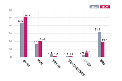 ¿¬·Éº°·Î »õ´©¸®´ç ÁöÁö´Â 60´ë ÀÌ»ó(73.9%)°ú 50´ë(65.1%), ¹ÎÁÖ´ç ÁöÁö´Â 40´ë(34.2%)¿Í 30´ë(29.7%)¿¡¼, Á÷¾÷º°·Î »õ´©¸®´ç ÁöÁö´Â ÀÚ¿µ¾÷(67.3%)°ú Àü¾÷ÁÖºÎ(64.0%), ¹ÎÁÖ´ç ÁöÁö´Â »ý»ê/ÆÇ¸Å/¼ºñ½ºÁ÷(37.8%)°ú »ç¹«/°ü¸®Á÷(34.4%)¿¡¼ ÀÀ´ä·üÀÌ ³ô¾Ò´Ù.