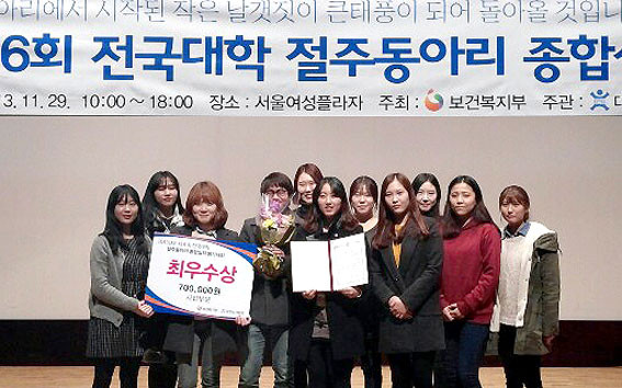 Áö³ 1¿ù 29ÀÏ ¼¿ï¿©¼ºÇÁ¶óÀÚ¿¡¼ º¸°Çº¹ÁöºÎ°¡ ÁÖÃÖÇÏ°í ´ëÇѺ¸°ÇÇùȸ°¡ ÁÖ°üÇÑ ¡®2013³â Á¦6ȸ Àü±¹´ëÇÐ ÀýÁÖµ¿¾Æ¸® Á¾ÇÕ½ÇÀû Æò°¡´ëȸ¡¯¿¡¼ ÀýÁÖµ¿¾Æ¸® »ç¾÷ºÎ¹® ÃÖ¿ì¼ö»óÀ» Â÷ÁöÇÑ °Í.
