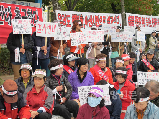 10¿ù 15ÀÏ ¿ÀÀü 10½Ã ¹è¹æÀ¾ ÀÚÀÌ1Â÷¾ÆÆÄÆ® ÁֹΠ50¿©¸íÀº ¾Æ»ê½Ãû ¾Õ¿¡ Áý°áÇØ ¡®¿ì¸®µµ ÇູÇÑ ¾Æ»ê½Ã¹ÎÀ¸·Î »ì°í ½Í´Ù¡¯, ¡®¾ÆÆÄÆ® ¾Õ º ¼ö¸Åâ°í °Ç¸³À» ¹Ý´ëÇÑ´Ù¡¯ µîÀÇ Çö¼ö¸·°ú ¸Ó¸®¡¤¾î±ú¶ì, ÇÇÄÏ µîÀ» µé°í ½ÃÀ§¸¦ ¹ú¿´´Ù.