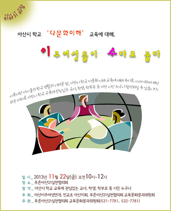 Ǫ¸¥¾Æ»ê21 ±³À°¹®ÈºÐ°úÀ§¿øÈ¸°¡ ÁÖ°üÇÏ°í ¾Æ»êÀÌÁÖ¿©¼º¿¬´ë, Àü±³Á¶ ¾Æ»êÁöȸ, Ǫ¸¥¾Æ»ê21½ÇõÇùÀÇȸ°¡ ÁÖÃÖÇÏ´Â ¡®¾Æ»ê½Ã Çб³ ´Ù¹®ÈÀÌÇØ ±³À°¿¡ ´ëÇØ ÀÌÁÖ¿©¼ºµéÀÌ ¼ö´Ù·Î Ç®´Ù¡¯ À̾߱⠸¶´çÀÌ ¿À´Â 11¿ù 22ÀÏ ¿ÀÀü 10½ÃºÎÅÍ 12½Ã±îÁö ¿Â¾ç¿Âõ¿ª¹æ¹®°´¼¾ÅÍ ³»¿¡ Àִ Ǫ¸¥¾Æ»ê21½ÇõÇùÀÇȸ ȸÀǽǿ¡¼ ÁøÇàµÈ´Ù.