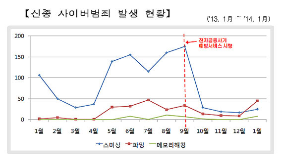 Áö³ÇØ ÃʺÎÅÍ ±Þ°ÝÈ÷ Áõ°¡ÇÑ ½ÅÁ¾ »çÀ̹ö¹üÁË´Â ±ÝÀ¶»çÀÇ ÀüÀÚ±ÝÀ¶»ç±â ¿¹¹æ¼ºñ½º ±ÝÀ¶»ç±â ÇÇÇØ¸¦ ¿¹¹æÇϱâ À§ÇØ ½Å¿ø È®ÀÎ ÀýÂ÷¸¦ °ÈÇÏ´Â ¼ºñ½º·Î ¡â°í°´ÀÌ °øÀÎÀÎÁõ¼¸¦ ¹ß±Þ ¶Ç´Â Àç¹ß±Þ ¹Þ´Â °æ¿ì ¡âÀÎÅÍ³Ý ¹ðÅ·À» ÅëÇØ 300¸¸ ¿ø ÀÌ»ó ÀÌüÇÏ´Â °æ¿ì Àü¸é ½ÃÇà(2013³â 9¿ù) ÀÌÈÄ ±× ÇÇÇØ°¡ ¸¹ÀÌ ÁÙ¾îµé°í ÀÖ´Â Ãß¼¼ÀÌÁö¸¸, ¡®ÆÄ¹Ö¡® ¹üÁËÀÇ °æ¿ì ¿ÃÇØ µé¾î ´Ù½Ã Áõ°¡ Ãß¼¼¸¦ º¸À̰í ÀÖÀ¸¸ç, ¡®½º¹Ì½Ì¡¯À̳ª ¡®¸Þ¸ð¸®ÇØÅ·¡¯ ¹üÁ˵µ ²öÀÌÁö ¾Ê°í ÀÖ´Â ½ÇÁ¤ÀÌ´Ù.