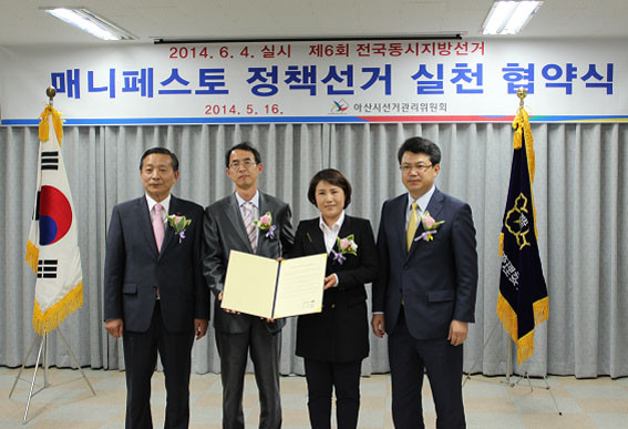 À̳¯ Çù¾à½Ä¿¡´Â ¾Æ»ê½ÃÀå¼±°Å Èĺ¸ÀÚ 3¸íÀÌ ¸ðµÎ Âü¼®ÇØ ¡®Á¤Ã¥¼±°Å ½Çõ Çù¾à¼¡¯¿¡ ¼¸íÇÔÀ¸·Î½á ³²Àº ±â°£ µ¿¾È µ· ¼±°Å, ºñ¹æ¡¤Èæ»ö¼±Àü, Ç÷¿¬, Çп¬, Áö¿¬ µî ¿¬°íÁÖÀÇ¿¡¼ ¹þ¾î³ª Á¤Ã¥À¸·Î °æÀïÇÏ°í °á°ú¿¡ ½Âº¹ÇÏ´Â ¼±°Å¹®ÈÀÇ Á¤Ã¥¿¡ ¾ÕÀå ¼³ °ÍÀ» ´ÙÁüÇß´Ù.