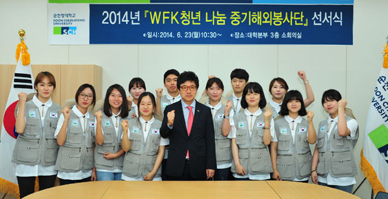 ¼øÃµÇâ´ëÇб³(ÃÑÀå ¼±³ÀÏ)´Â ÀçÇлý 12¸íÀÌ ±³À°ºÎÀÇ ´ëÇлý ÇØ¿Ü ºÀ»ç»ç¾÷À» ÁÖ°üÇÏ´Â ´ë»çÇù(Çѱ¹´ëÇлçȸºÀ»çÇùÀÇȸ)À¸·ÎºÎÅÍ ¡®2014 WFK û³â Áß±âÇØ¿ÜºÀ»ç´Ü¡¯¿¡ ¼±¹ßµÅ 6¿ù 23ÀÏ ¿ÀÀü ±³³»¿¡¼ ¼±¼½ÄÀ» °®°í º»°ÝÀûÀ¸·Î ÇØ¿ÜºÀ»ç¿¡ ÇÊ¿äÇÑ ¼Ò¾ç°ú Àü¹®±³À°¿¡ µ¹ÀÔÇß´Ù°í ¹àÇû´Ù.