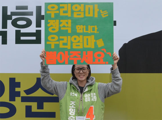 ¼¿ï½ÃÀå, ¼¿ï½Ã±³À°°¨ ¼±°Å¿¡¼ Èĺ¸ÀÚµéÀÇ ÀÚ³àµéÀÌ À̽´°¡ µÇ°í ÀÖ´Â °¡¿îµ¥ ¾Æ»ê½ÃÀå Á¶¾ç¼ø Èĺ¸ÀÇ ÀÚ³à Áß Ã¹Â°µþÀÎ ±èµµÈñ(21¼¼) ¾çµµ ¾ö¸¶ÀÇ ½ÃÀå´ç¼±À» À§ÇØ ¾Æ»êÀ» ±¸¼®±¸¼® ´©ºñ°í ÀÖ´Ù.
