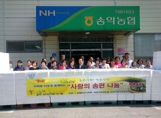 ³óÇù¾Æ»ê½ÃÁöºÎ(¾çűæ ÁöºÎÀå)¿Í °ü³» 10°³ Áö¿ª³óÇùÁ¶ÇÕÀå(Á¶ÇտÇùÀÇȸÀÇÀå ±èÂù¼® µÐÆ÷Á¶ÇÕÀå) µîÀÌ Âü¿©ÇØ ¿ì¸®Áö¿ª¿¡¼ »ý»êµÈ ¿ì¸®³ó»ê¹°·Î Á÷Á¢ ºúÀº »ç¶ûÀÇ ¼ÛÆí(3kg 600¹Ú½º)À» Ãß¼®(ÇѰ¡À§)À» ¸Â¾Æ ¿Ü·ÎÀÌ »ç½Ã´Â µ¶°Å³ëÀΰú ¼Ò³â¼Ò³à°¡Àå, ´Ù¹®È°¡Á¤, »õÅ͹εî 600¿© °¡Á¤¿¡ ³ó°¡ÁֺθðÀÓ È¸¿ø°ú ³óÇùÀÓÁ÷¿øµîÀÌ ÇÔ²² ¹æ¹®ÇØ Àü´ÞÇß´Ù.
